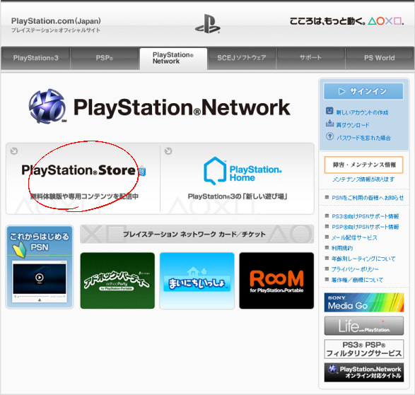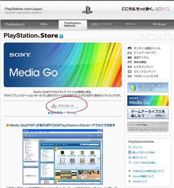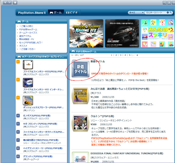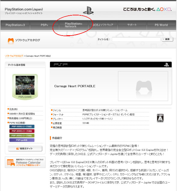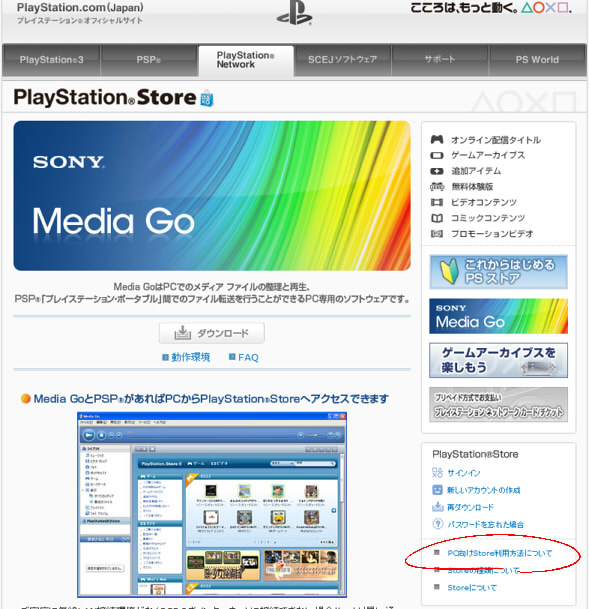 そうならそうと書いておいて欲しいです。 あえて攻略カテゴリー。 PSP公式のソフトウェアカタログです。 ここに「ダウンロードするには」とか注意書きが欲しいわけですよ。 まずは「PlayStationNetwork」タブをクリックします。 右下に「Media Go」へのリンクバナーがあるのでそれ踏んだほうが早いですが。 気づかずにPlayStationStoreをクリック。 「PC向けStore利用方法について」をクリックします。 ここで初めてツールが必要なことを知りました。 ダウン&インストール、起動します。 PlayStationStoreから「PSP用Newゲーム」を開きます。 他のページにはないです。検索からも飛べません。 新着タイトルをクリックして最後のほうにあります。 以上です。 お金のことに関しては省略です。 ふむぅ…… 買う気まんまんだったのですが、 いまさらメモリスティックの容量が足りないことに気づきましたよ。 「かるぴすと」には、64MBより大きいメモリースティックはいらない。 そんなことないじゃないですか!嘘つき!えーん! なんとかマネーを5000円分チャージしてしまったので後には引けません。 とりあえずメモリースティックと、あといいかげんPSP-1000を買い換えたいです。 PR この記事にコメントする