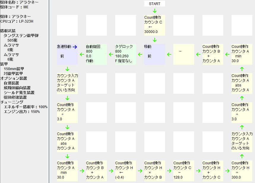 ホイリー・チァーイカあたりの足を引っ張るのを目的として。 機雷は、ないかなぁ やはりビームかミサイルか。 ノラ1+トリン2 ノラ2+トリン1 ノラとトリンは相補的だと思うのですよ。 とか考えてるものの手付かずです。 行けそうな戦術がまったく思いつかないのです 日記はOperaさんが消去してくれました そういうわけで今回も調査だけです テーブルがめどいので見難いです ■基本消費量 急速移動 0.80GJ 急速旋回 1.70|0.80GJ 格闘 1.20GJ ガード 0.60GJ 伏せ 0.40GJ 特殊12 1.20~4.80GJ 射撃 0.20GJ 旋回移動 0.28|0.20GJ 移動射撃 0.60GJ 小ダメージ 0.12GJ 大ダメージ 0.01GJ 95立ち上り 8.39GJ / 14f = 0.60 96跳ね起き 9.49GJ / 15f = 0.63 ※補足 ・急速旋回は1f、4fなど踏み切りの際に1.70GJ/f ・旋回移動は1f、5fなど踏み切りの際に0.28GJ/f ・格闘は遠距離格闘で跳躍中のみ平均1.00GJ/f ・特殊動作1,2はフレームごとに以下を計測 1.20/1.20/3.90/1.20/1.20/4.80/1.20/1.20/3.20以下省略 ・射撃チップのグレネード投擲は正面で0.20GJ/f,およそ45°で0.32GJ/f ただし移動射撃ではW2,W3と同じく0.60GJ/f ・ジャンプは重力の違う2フィールドで計測すれば空中分解できそう ■座標上の移動距離と速度 【上段+前急速】(13.63m, 右1.19m, 前13.58m, +5°) 上段\前急速 3f 2f 2f 2.72m/f(294km/h) 3.41m/f(368km/h) 1f - 4.54m/f(491km/h) 【上段+前移動】(13.14m, 右1.19m, 前13.09m, +5°) 上段\前移動 4f 3f 2f 2f 2.19m/f(237km/h) 2.63m/f(284km/h) - 1f - 3.29m/f(355km/h) 4.38m/f(473km/h) 【上段+特殊1】(8.82m, 右6.05m, 前6.42m, +43°) 上段\特殊1 2f 1f 2f 2.21m/f(238km/h) - 1f - 4.41m/f(476km/h) 【左急速+前急速】(10.20m, 左5.52m, 前8.57, -33°) 左急速\前急速 3f 2f 3f 1.70m/f(184km/h) - 2f - 2.55m/f(275km/h) 【特殊2+前急速】(8.33m, 左4.86m, 前6.77m, -36°) 特殊2\前急速 3f 2f 2f 1.67m/f(180km/h) 2.08m/f(225km/h) 1f - 2.78m/f(300km/h) 【特殊2+後急速】(7.98m, 左4.86m, 後6.33m, -144°) 特殊2\後急速 3f 2f 2f 1.60m/f(172km/h) 2.00m/f(215km/h) 1f - 2.66m/f(287km/h) 【後退+後急速】(12.50m, 後12.50m, +180°) 後退\後急速 3f 2f 4f 1.79m/f(193km/h) - 3f 2.08m/f(225km/h) 2.50m/f(270km/h) 2f - 3.13m/f(338km/h) 自動旋回は指定した角度とターゲットの位置が離れるほど旋回量が 【消費EN(GJ)】急速前進 前進 前進射撃 自動旋回OFF 0.80 0.10 0.60 30度 0.85 40度 0.87 60度 0.90 0.20 0.70 90度以降 0.95 0.25 0.75 上記(アラクネー)では6度あたり0.01GJの追加消費があり マリアエレナおよびアングリフの急速前進では1.28GJが1.43GJ ジェイラーの急速前進は0.80GJが0.95GJ いずれも最大で0.15GJの増分でした。 上記データは動作を1Fキャンセルで実行し旋回を抑制しています。 そこでターゲットのいる方向を元に消費量を算出し